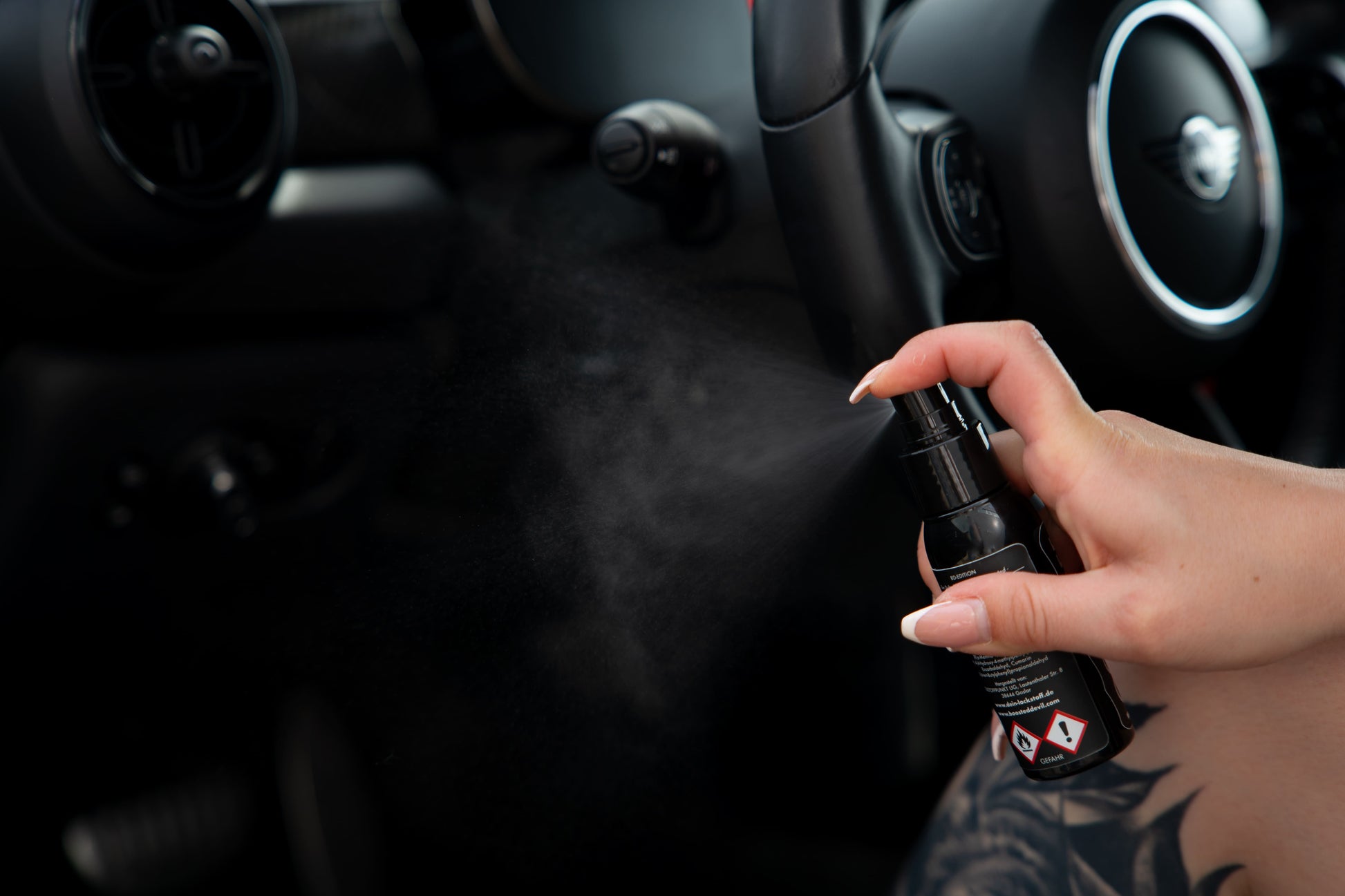 Gib je 2-6 Sprühstöße in den Innenraum Deines Autos* und lass diese setzen. Der Duftnebel kann sich bedenkenlos auf Sitze und Armaturen legen. Wir haben Carparfüm akribisch auf Materialverträglichkeit geprüft.